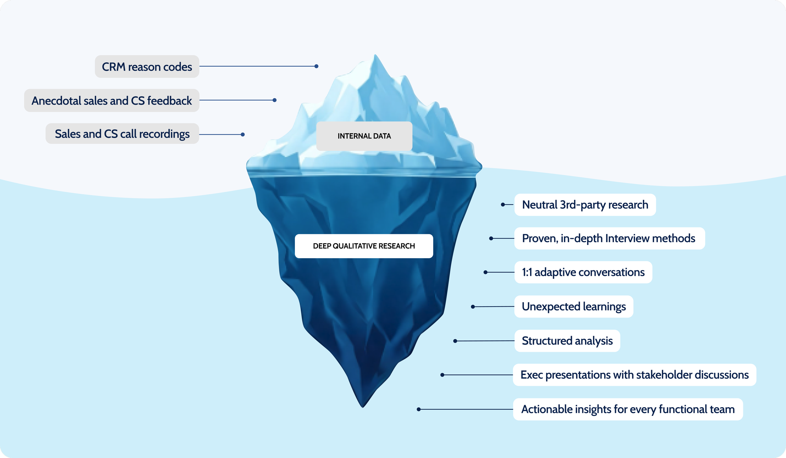 IcebergIQ uncovers the truth behind wins, losses, and churn. Using proven research methods, we engage buyers and customers in deep conversations to uncover insights that inform GTM strategy, sales operations, product decisions, and retention. How it works